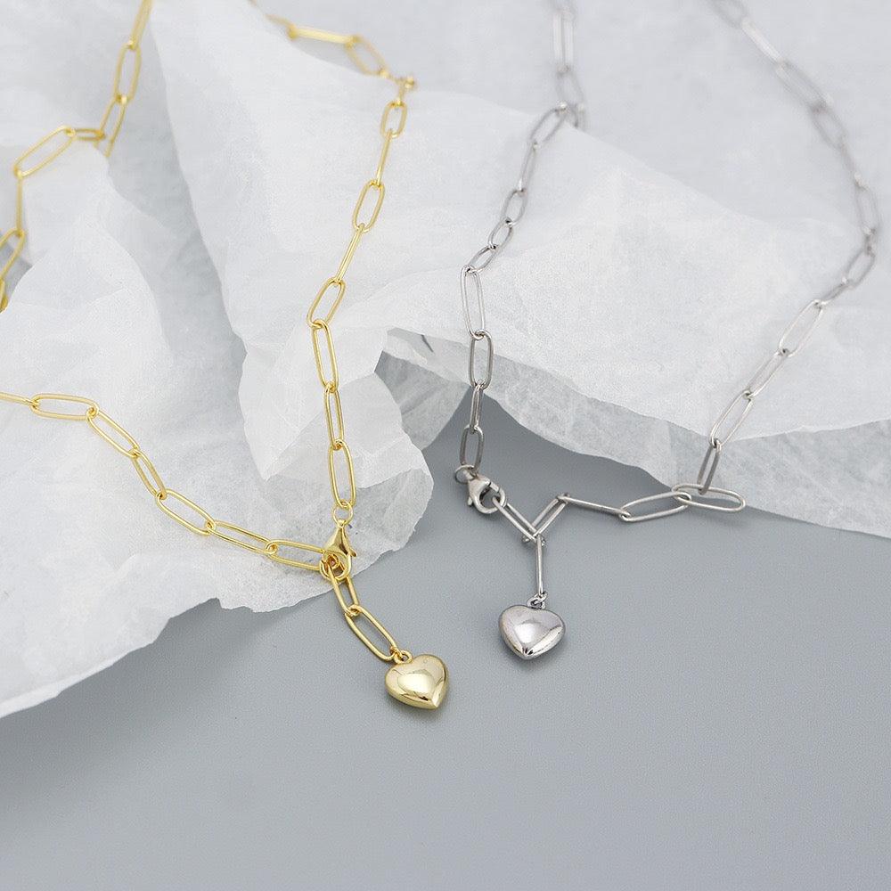 The pendant showcases a beautifully polished puffed heart, gracefully suspended from a dainty chain. Whether worn alone for an elegant statement or layered with other necklaces, this versatile piece adds a touch of charm to your style. For a cohesive and captivating look, consider pairing it with our matching heart-themed attire. Let this necklace symbolize the key to your heart and become a cherished part of your jewelry collection. Elevate your style and celebrate love with The Heart Padlock Necklace.